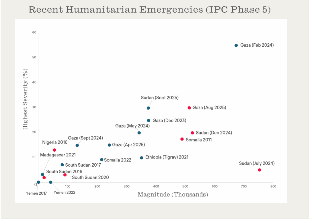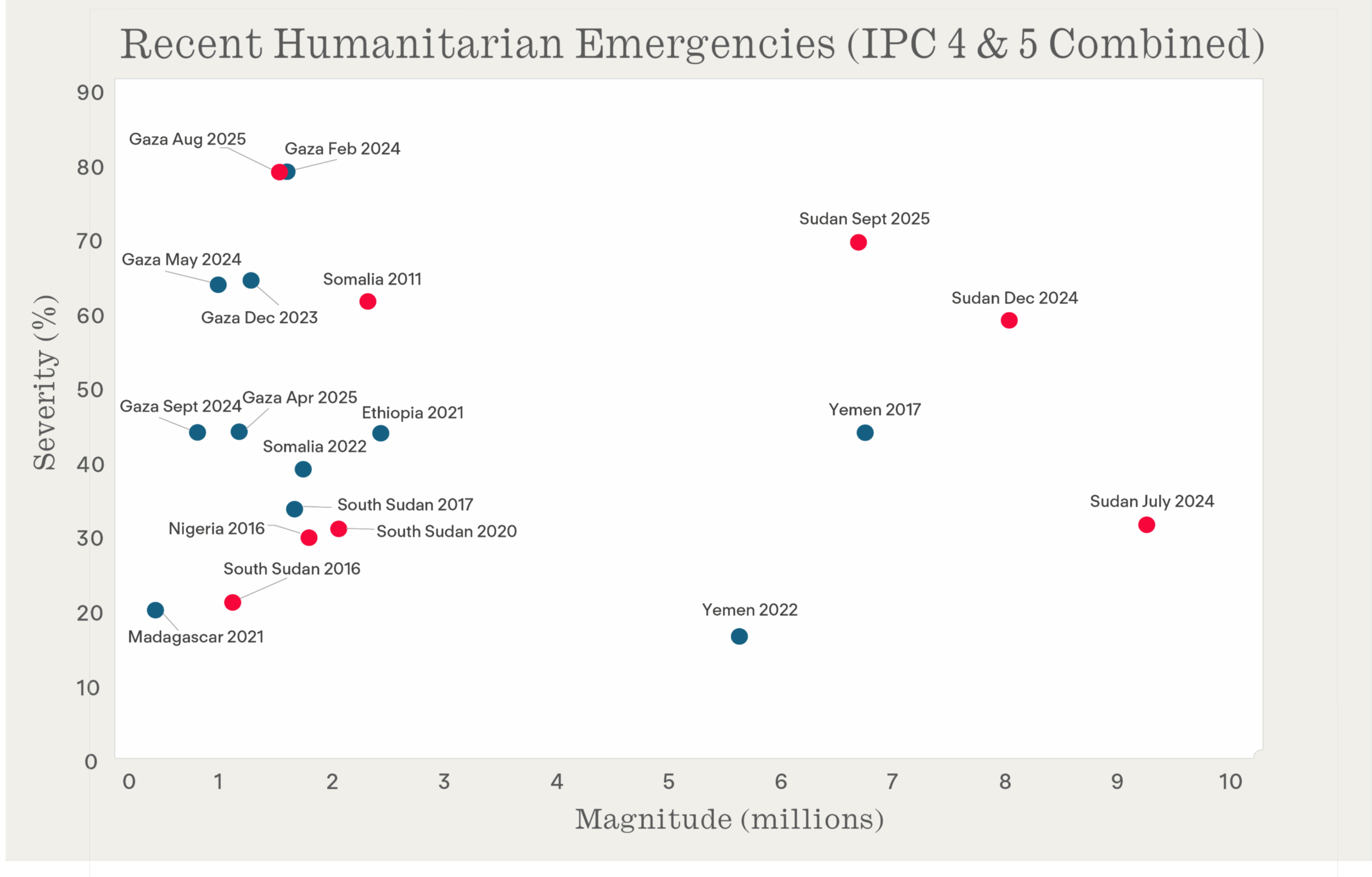 What this figure makes clear is that Sudan is the worst by magnitude, with Yemen coming close. Gaza, Sudan and Somalia (2011) had the most severely affected locations. It’s also evident that there’s no simple correspondence between these metrics and the ‘famine’ determination. There are cases of very high numbers, and considerable severity, in which the specific threshold for ‘famine’ wasn’t crossed—or to be precise, the data weren’t available for the FRC to conclude, with confidence, that it had been crossed.