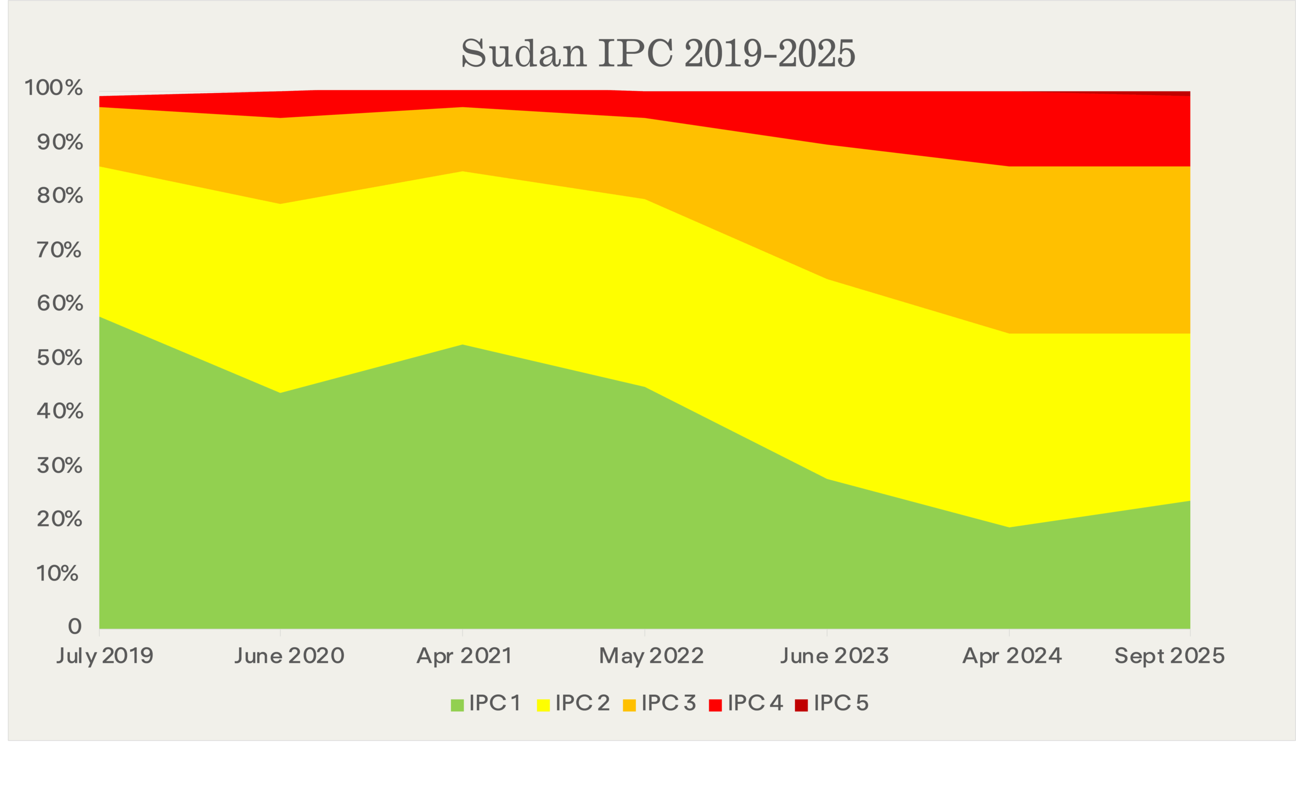 These only tell part of the story. The following two figures show trajectories into famine. In Sudan there is a slow descent. In parts of the country, famine conditions were determined in April 2024, though they had likely existed for some time prior.