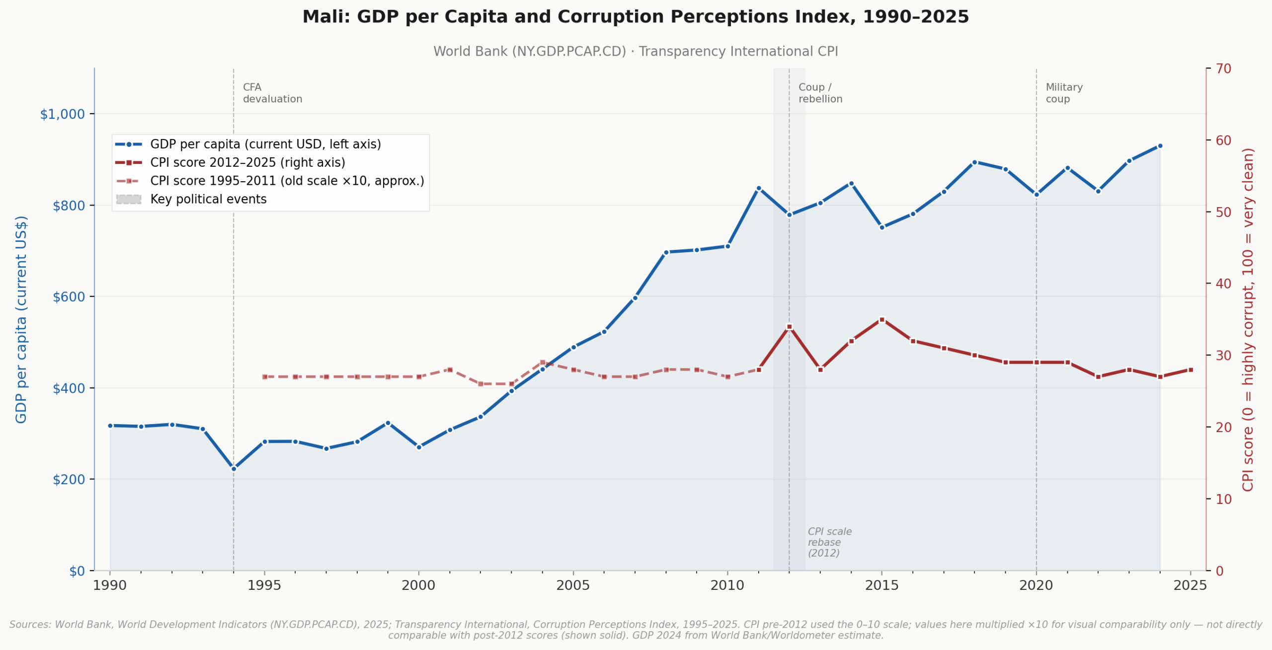 Sources: World Bank, World Development Indicators (NY.GDP.PCAP.CD), 2025; Transparency International, Corruption Perceptions Index, 1995-2025. CPI pre-2012 used the 0-10 scale; values here are multiplied x10 for visual comparability only – not directly comparable with post-2012 scores (shown solid). GDP 2024 from World Bank/Worldometer estimate. World Peace Foundation (2026)