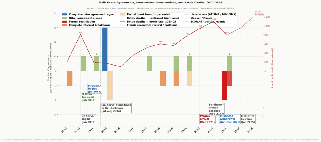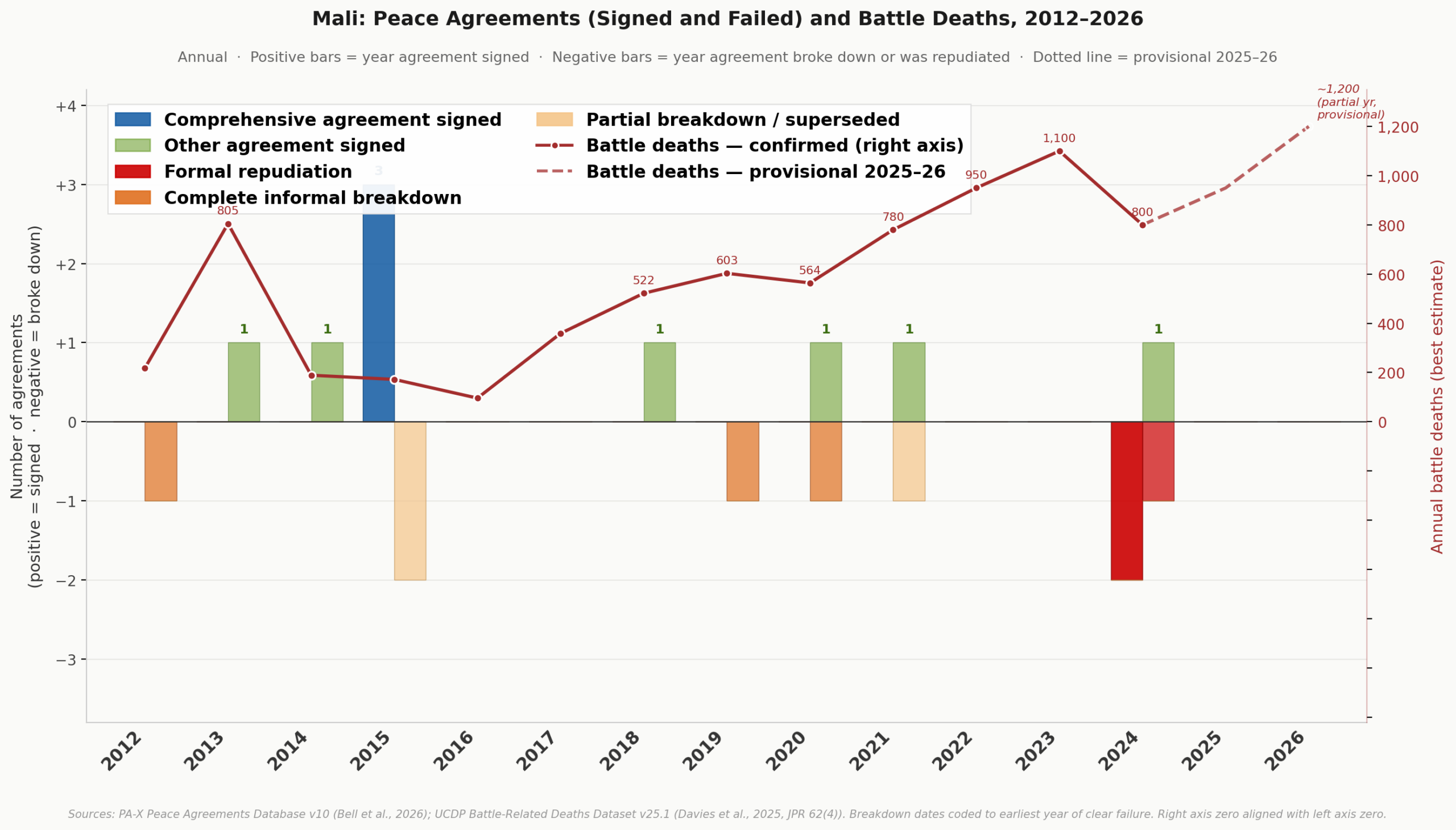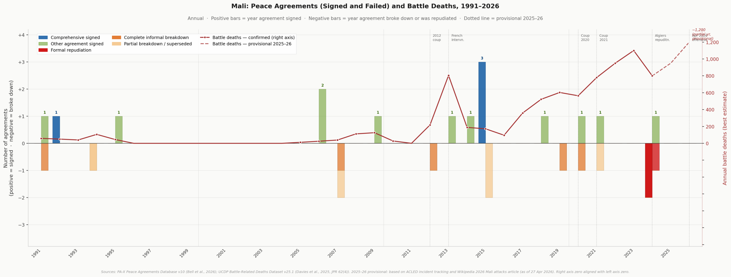 Sources: PA-X Peace Agreements Database v10 (Bell et all., 2026); UCDP Battle-Related Deaths v25.1 (Davies et al., 2025, JPR 62(4)). 2025-26 provisional: based on ACLED incident tracking and Wikipedia 2026 Mali attacks article (as of 27 April 2026). Right axis zero aligned with left axis zero. World Peace Foundation (2026)