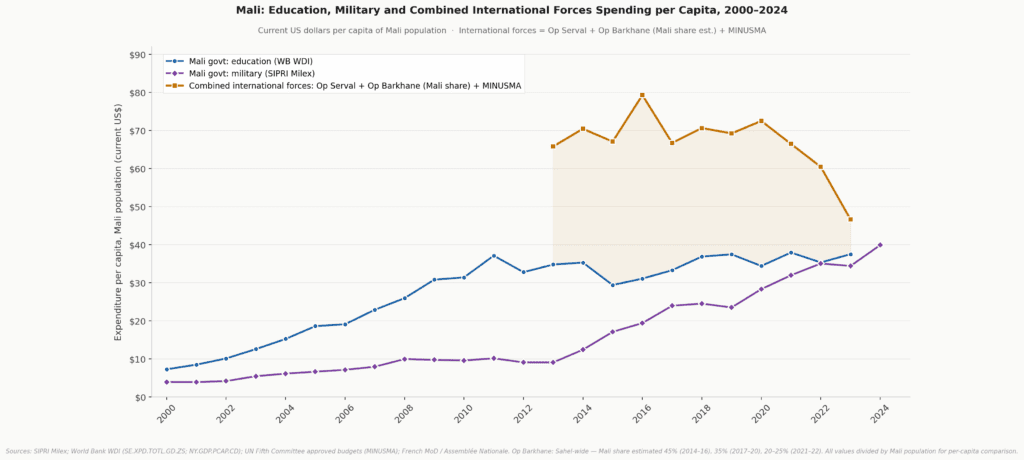 Sources: Bank WDI (SE.XPD.TOTL.GD.ZS; NY.GDP.PCAP.CD); UN Fifth Committee approved budgets (MINUSMA); French MoD / Assemblée Nationale. Op Barkhane: Sahel-wide – Mali share estimate 45% (2014-16), 35% (2017-20), 20-25% (2021-22). All values divided by Mali population according to UNPD. World Peace Foundation (2026)